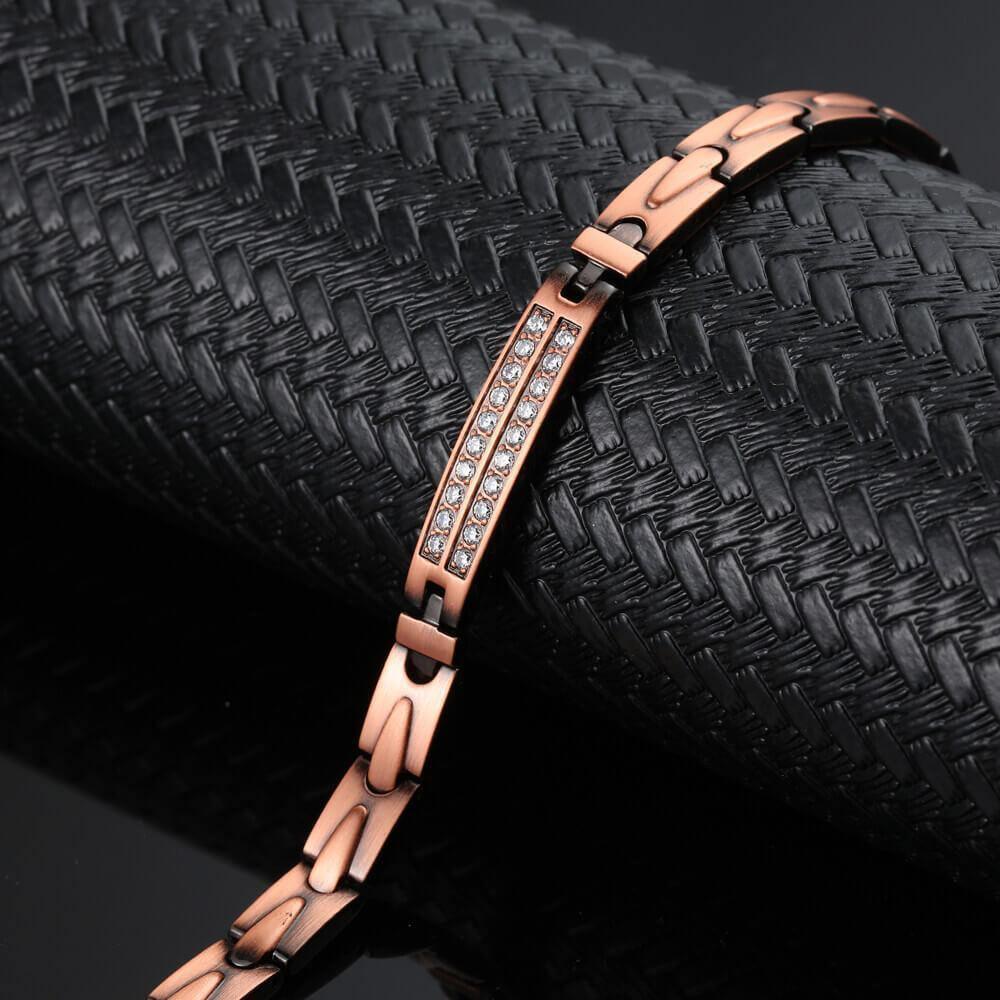 What we have right here is a striking copper magnetic link therapy bracelet has been perfectly crafted with a smooth copper finish and the unique use of diamantes, to add a touch of class and glamour to any occasion.