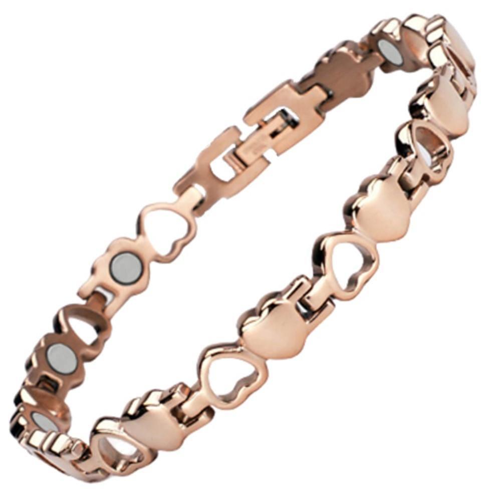 Ladies design magnetic bracelet for women made from stainless steel, featuring a high polished rose gold finish with a cute discreet fold over hinged clasp. Containing 11 high power 3500 Neodymium magnets making it a lot stronger than others.