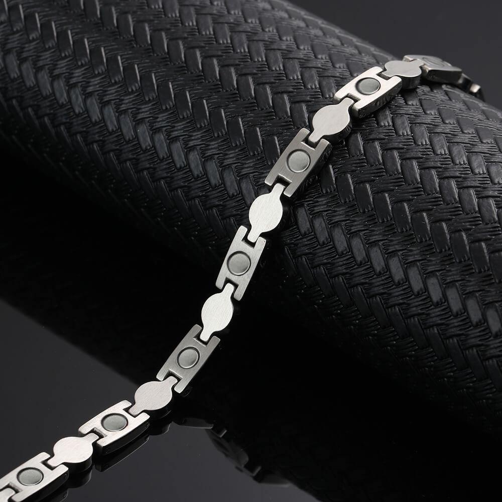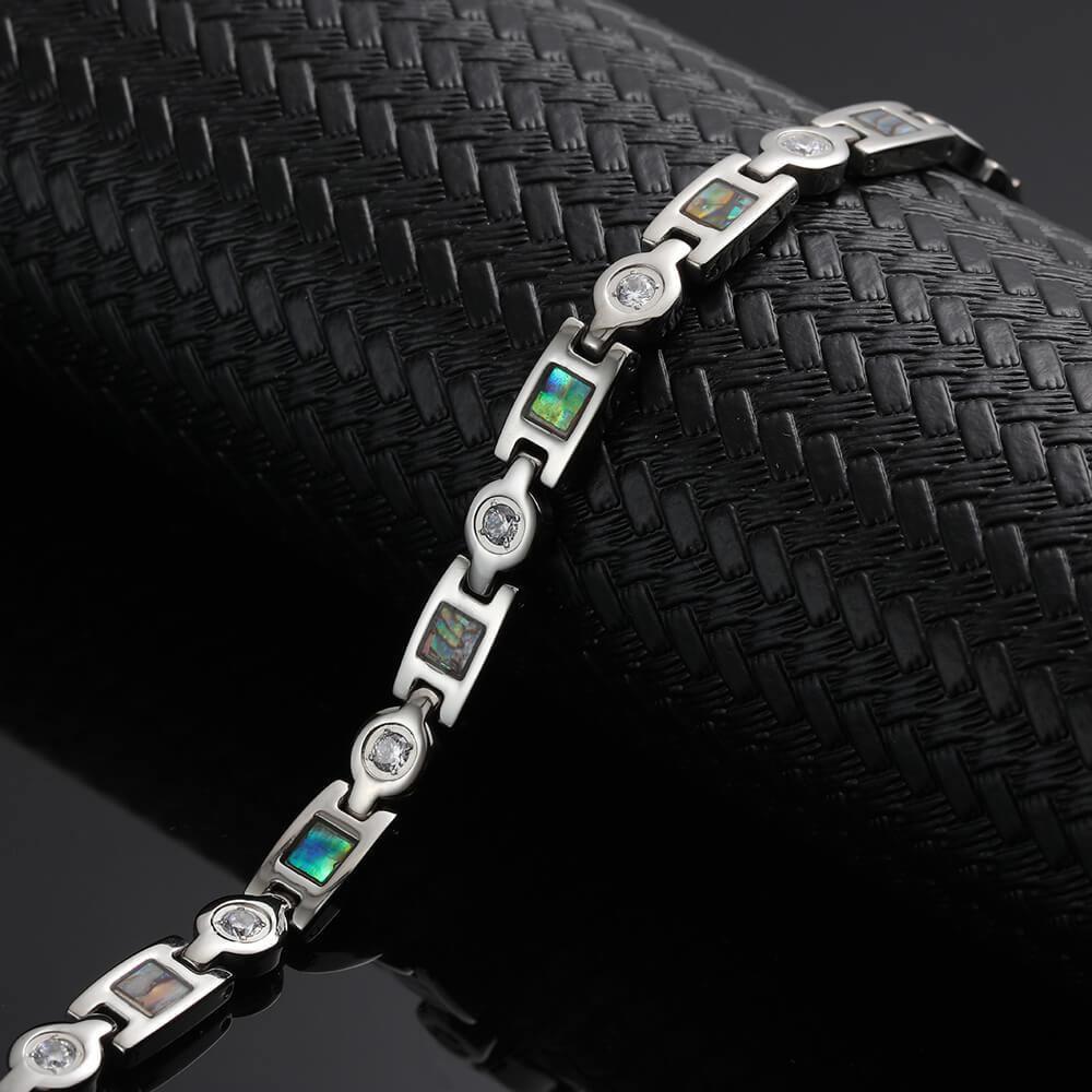 Sophisticated and elegant women's silver stainless steel magnetic bracelet with a polished finish, superb little crystals and an intricate enamel design that would look outstanding upon the wrist of any lady. The links of this bracelet have an intriguing shape with the addition of strong gauss magnets on the rear. Moreover, a reliable fold over clasp that is almost indistinguishable from the rest of the magnetic bracelet.