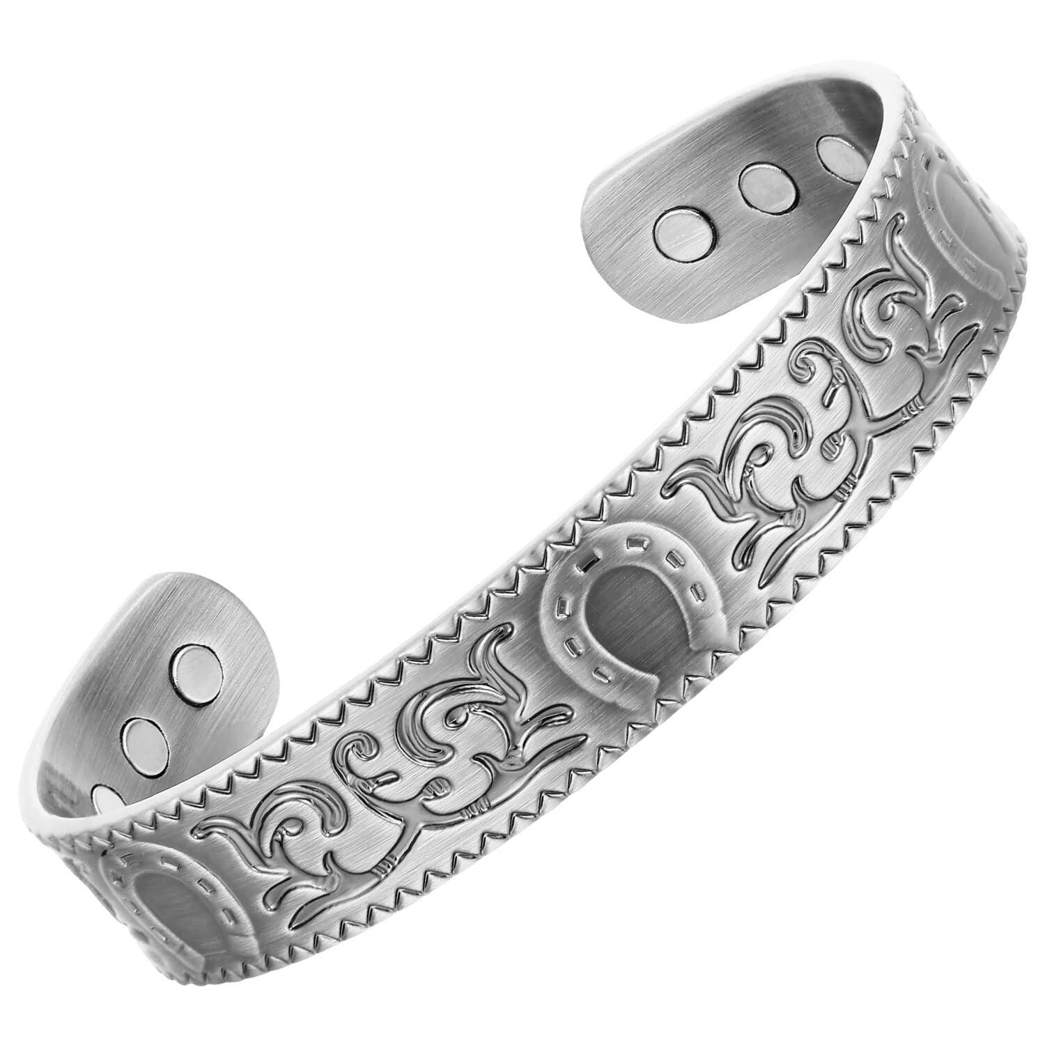 Experience luck and prosperity with our Lucky Horseshoe Magnetic Therapy Silver Copper Bangle. Made with pure copper and powerful neodymium gauss magnets, this bangle will bring positive energy and good fortune to your life. Comes in a gift box for the perfect present. Feel the benefits and elevate your well-being today!