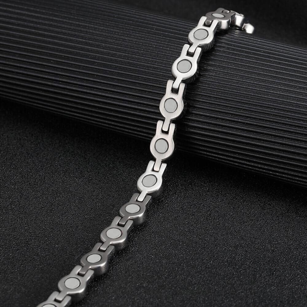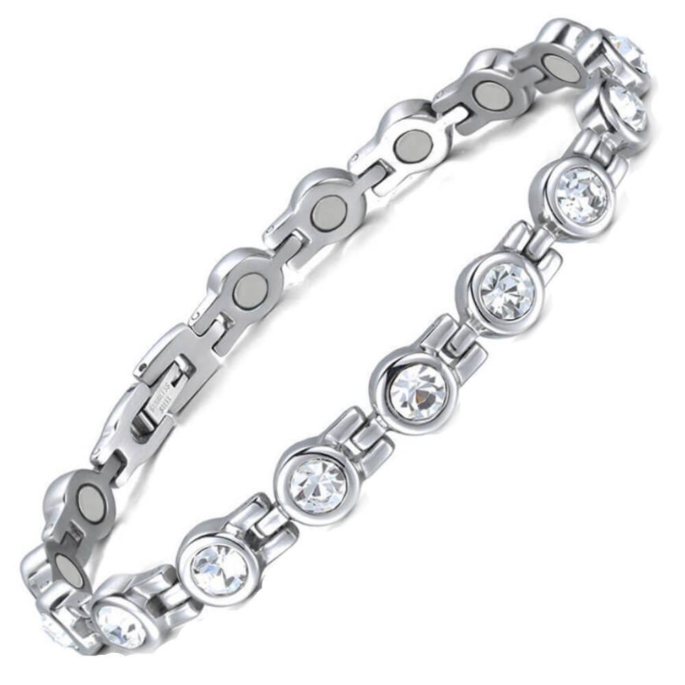 Made from quality hypoallergenic stainless steel, this stunning and stylish women's magnetic bracelet with 16x powerful gauss magnets and beautifully crafted crystals wrapped all around.