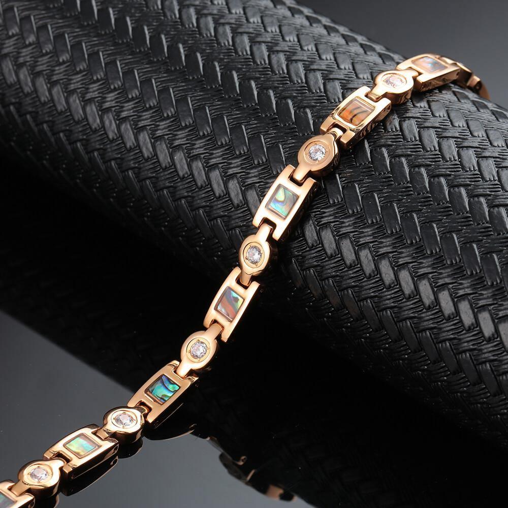 Elegant & sophisticated women's rose gold stainless steel magnetic bracelet with a polished finish, stunning little crystals and an intricate enamel design that would look beautiful upon the wrist of any lady. The links of this bracelet have an intriguing shape and has strong gauss magnets on the rear of this statement piece. A reliable fold over clasp that is almost indistinguishable from the rest of the bracelet.