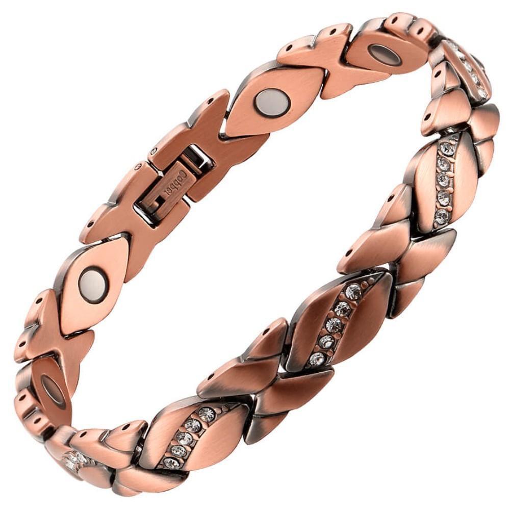 This beautiful eye catching women's copper bracelet is bold and very bling. Combining a smooth finish cross-link design and a row of diamante crystals, this gorgeous ladies bracelet is sure to make a statement. This luxury bracelet can be easily shortened to fit any size or wrist comfortably with our free link remover tool provided. All our bracelets also use a strong fold over clasp to keep it safe and secure.