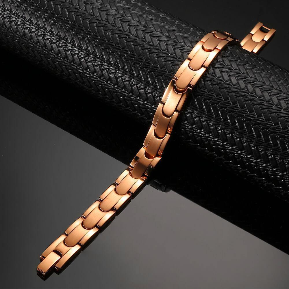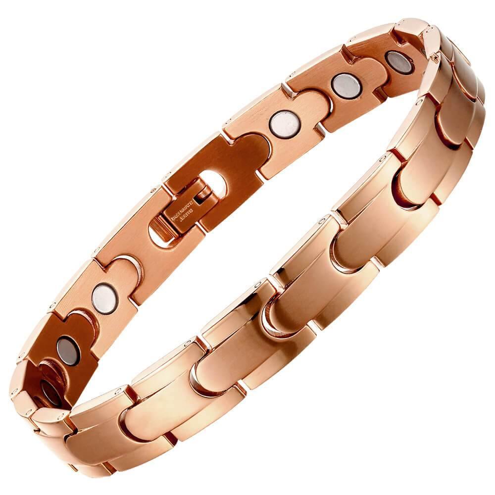 Simple but stylish bracelet made from stainless steel, featuring a high polished rose gold finish with a discreet fold over hinged clasp. Contains 16 high powered 3500 Neodymium magnets making it a lot stronger than others!