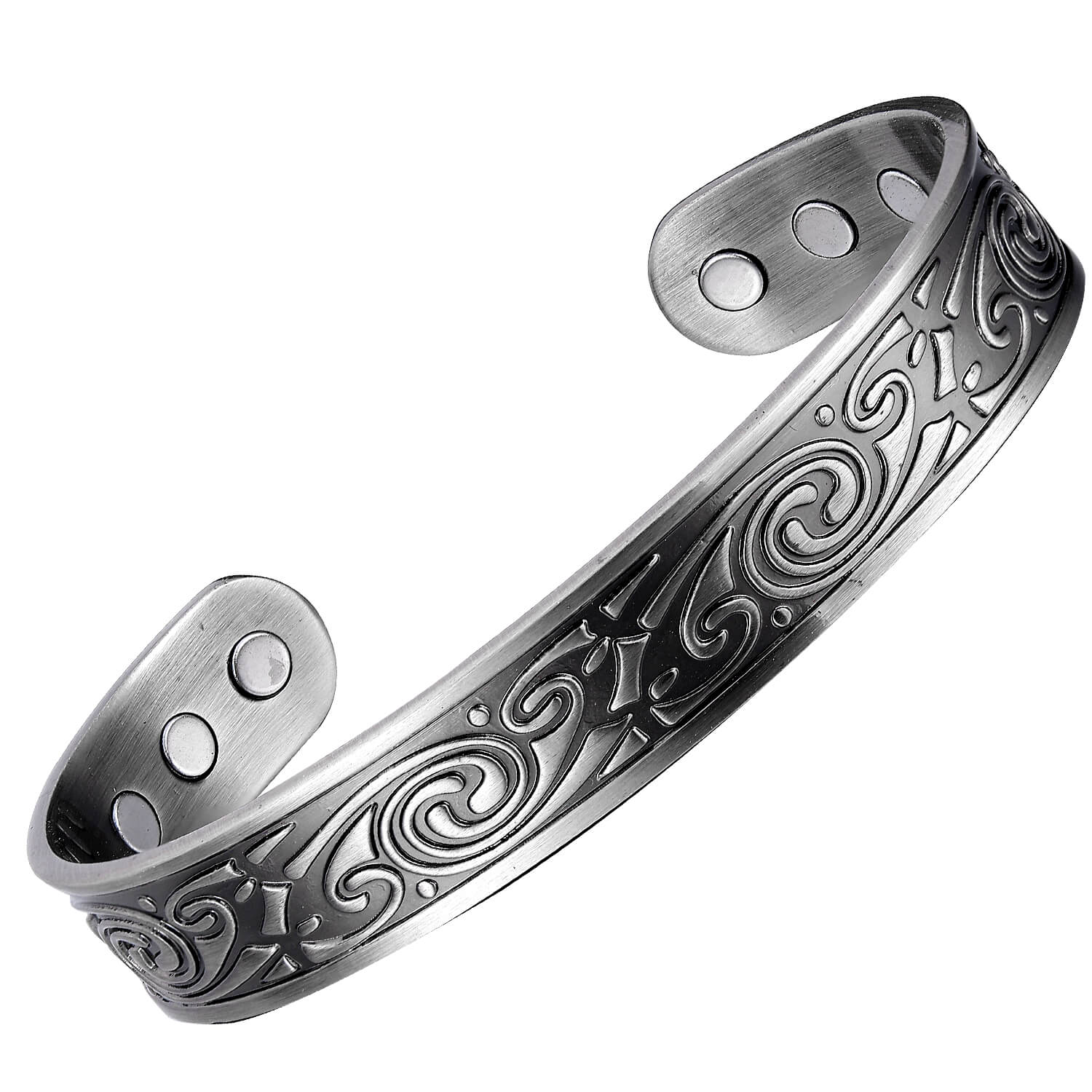 Discover the power of our Swirl Design Silver Copper Magnetic Bangle for your overall well-being! Made with hypoallergenic materials and featuring 6x powerful 3500 gauss therapy magnets, this bangle offers fast and free UK delivery, a gift box, and a price match guarantee.